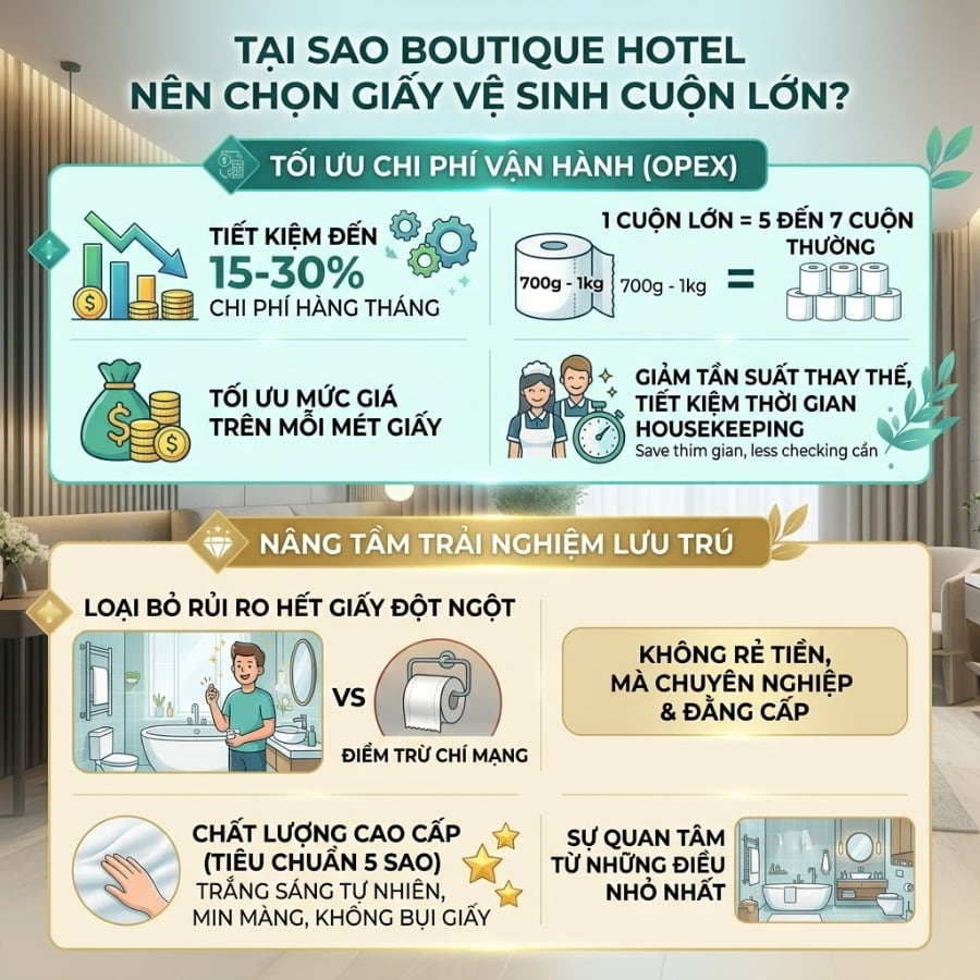 Trong ngành Hospitality, bài toán Opex (chi phí vận hành) luôn là một thử thách. Các Boutique Hotel tuy có quy mô không quá khổng lồ nhưng lại đòi hỏi mức độ dịch vụ cá nhân hóa cực cao. Việc sử dụng các cuộn giấy nhỏ truyền thống thường dẫn đến tình trạng lãng phí lõi giấy, hoặc nhân viên buồng phòng phải vứt bỏ những cuộn dùng dở để thay cuộn mới đón khách, gây ra sự lãng phí không hề nhỏ.
