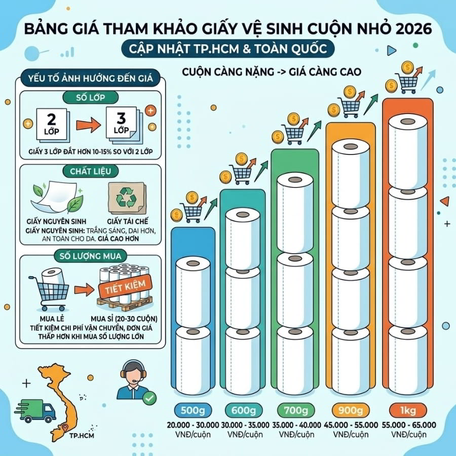 Cần lưu ý rằng, giá trên có thể thay đổi tùy theo thương hiệu, số lớp giấy (2 – 3 lớp), chất liệu giấy (nguyên sinh hoặc tái chế), khu vực giao hàng và chính sách chiết khấu theo số lượng. Cuộn càng nặng, càng nhiều lớp thì giá càng cao. Giấy 3 lớp thường đắt hơn giấy 2 lớp khoảng 10 – 15%. Đối với dòng giấy nguyên sinh, mức giá sẽ cao hơn giấy tái chế, nhưng bù lại giấy trắng sáng, dai hơn và an toàn tuyệt đối cho da nhạy cảm. Việc mua từ 20 – 30 cuộn sẽ giúp tiết kiệm chi phí vận chuyển và đơn giá thấp hơn nhiều so với mua lẻ.