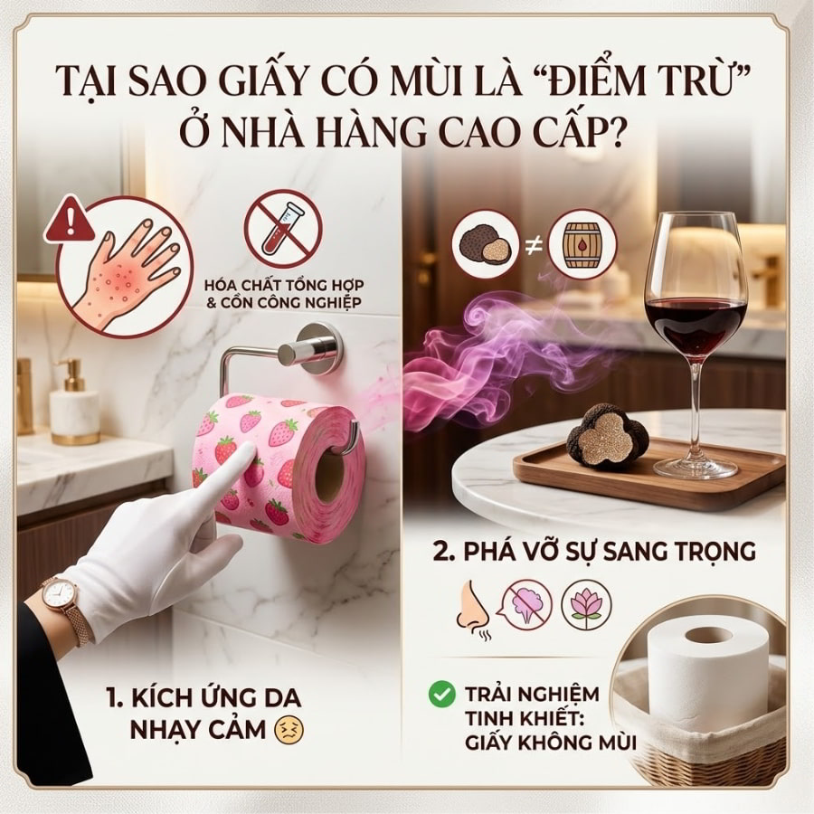 Nhiều người lầm tưởng rằng thêm một chút hương thơm vào giấy vệ sinh sẽ giúp không gian toilet trở nên dễ chịu hơn. Thế nhưng, trong ngành dịch vụ cao cấp, quan niệm này lại đi ngược với tiêu chuẩn chất lượng và có thể gây ra những hậu quả tiêu cực.