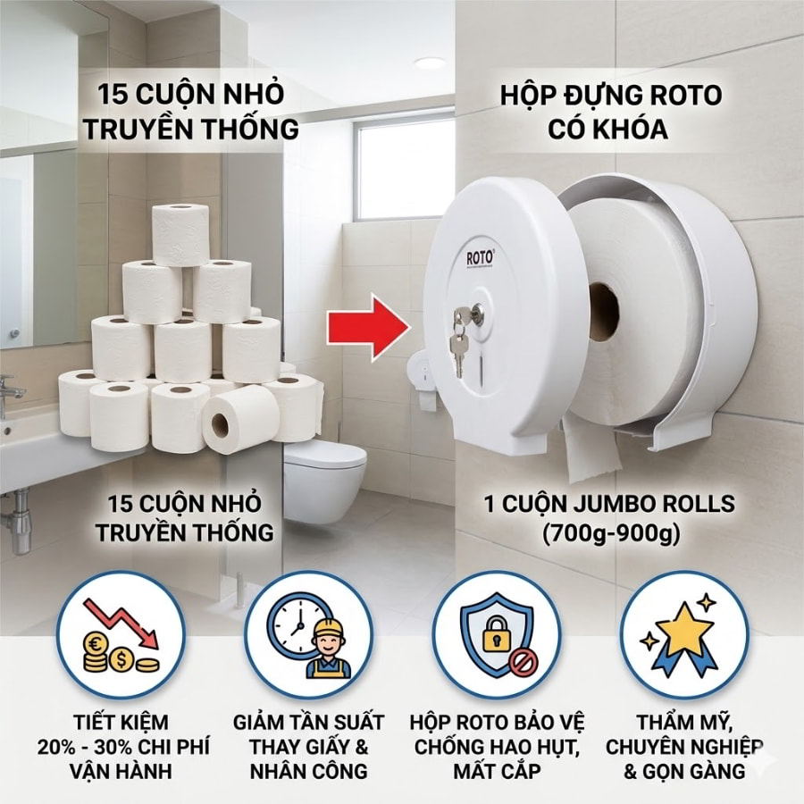 Trong môi trường ẩm ướt như nhà vệ sinh, giấy cuộn nhỏ để bên ngoài rất dễ bị thấm nước, rơi rớt xuống sàn hoặc bám bụi bẩn, vi khuẩn. Những phần giấy hỏng này buộc phải vứt bỏ, gây lãng phí nghiêm trọng. Khi sử dụng hộp đựng có khóa an toàn (như các dòng Roto bằng nhựa ABS siêu bền), cuộn giấy được bảo vệ hoàn toàn trong môi trường kín đáo, khô ráo. Nó hạn chế tình trạng khách hàng cố tình vò nát giấy xả láng, và đặc biệt, ngăn chặn triệt để tình trạng mất cắp giấy vật tư tại các khu vực đông người qua lại. Hơn thế nữa, một chiếc hộp giấy treo tường thiết kế hiện đại sẽ nâng tầm tính thẩm mỹ, tạo sự gọn gàng và chuyên nghiệp vượt bậc cho hình ảnh của tổ chức.