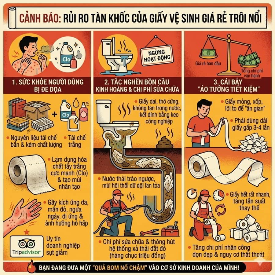 Việc nhắm mắt ký hợp đồng nhập sỉ những lô hàng giấy vệ sinh vô danh có thể mang lại niềm vui ngắn hạn trên báo cáo tài chính, nhưng thực chất bạn đang đưa một quả bom nổ chậm vào chính cơ sở kinh doanh của mình. Dưới đây là những sự thật trần trụi về dòng sản phẩm giá rẻ này.