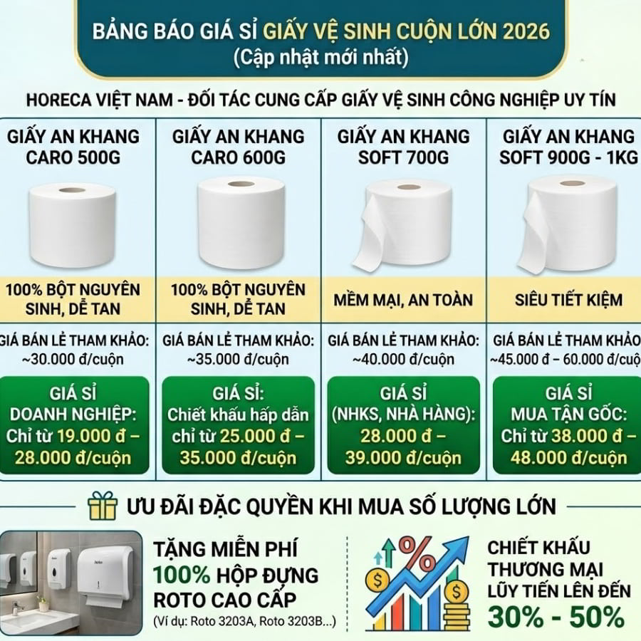 👉 Hành động ngay! Trải nghiệm sự khác biệt! Hãy truy cập ngay giayvesinh.com.vn hoặc nhấc máy gọi Hotline 0909 611 067 để yêu cầu GỬI MẪU THỬ MIỄN PHÍ TẬN NƠI. Nhận ngay bảng báo giá sỉ tận gốc cực kỳ ưu đãi cho năm 2026 và nắm bắt đặc quyền TÀI TRỢ MIỄN PHÍ HỘP ĐỰNG GIẤY CAO CẤP ROTO cho quán cafe, nhà hàng của bạn! Cùng Horeca Việt Nam, kiến tạo không gian vệ sinh đẳng cấp, sạch chuẩn, tiết kiệm tối đa ngay từ tháng này!