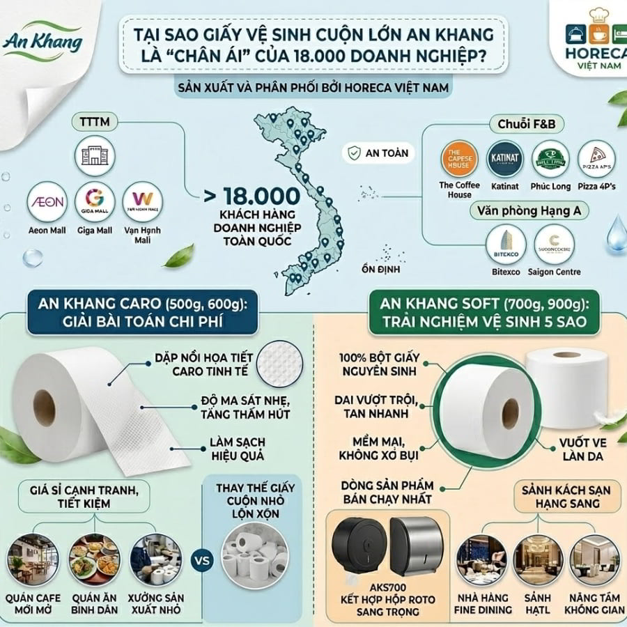 Nếu bạn đã từng dạo bước trong các trung tâm thương mại lớn như Aeon Mall, Giga Mall, Vạn Hạnh Mall, hay ghé thăm các chuỗi F&B đình đám như The Coffee House, Katinat, Phúc Long, Pizza 4P’s, hoặc làm việc tại các tòa nhà văn phòng hạng A (Bitexco, Saigon Centre)… chắc chắn bạn đã từng sử dụng Giấy vệ sinh công nghiệp An Khang.