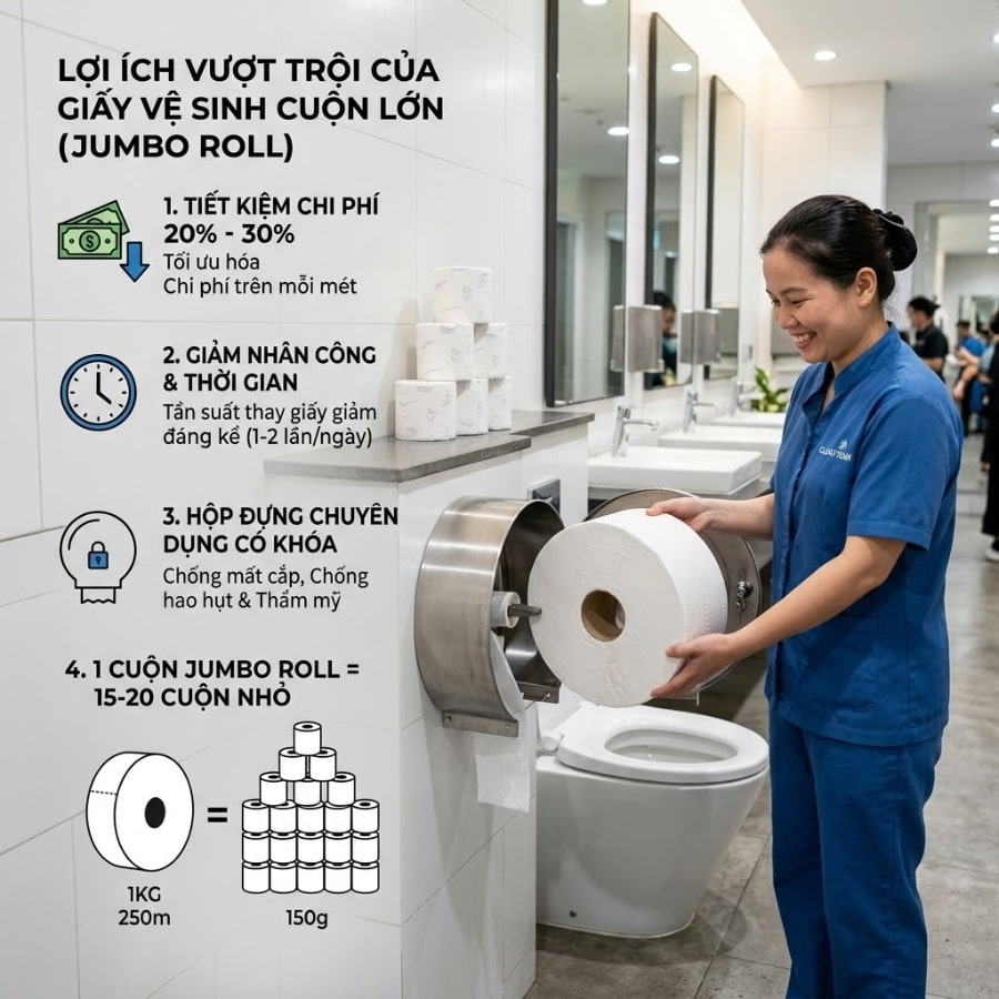 Mua giấy vệ sinh giá sỉ cuộn lớn (Jumbo Roll) mang lại những lợi ích vượt trội gì cho doanh nghiệp?