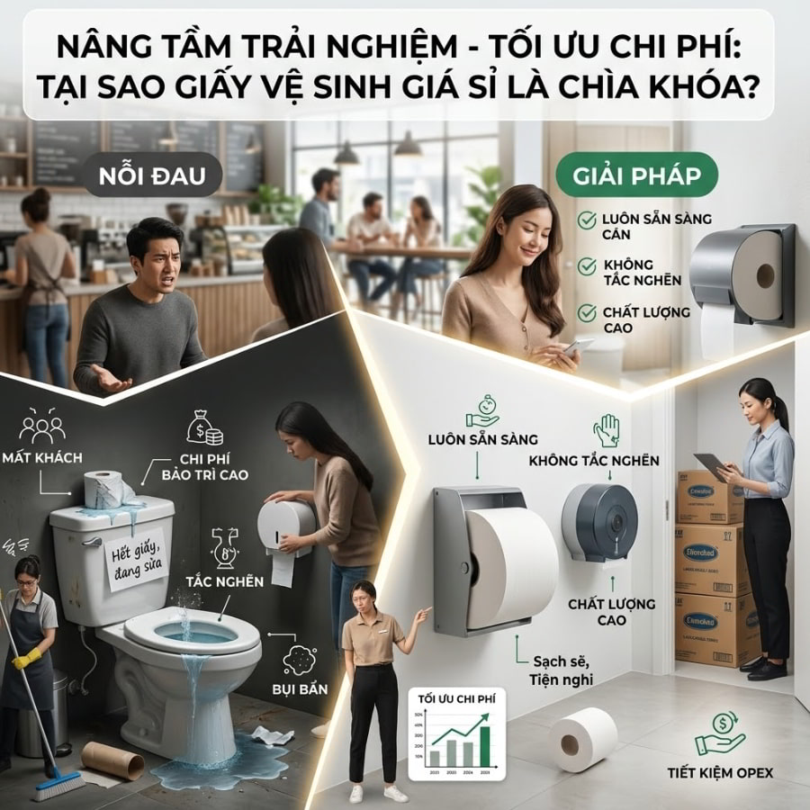 Bạn đang quản lý một quán cafe tấp nập, một nhà hàng sang trọng hay một chuỗi F&B lúc nào cũng kín bàn vào mỗi dịp cuối tuần? Hãy thử tưởng tượng một kịch bản kinh hoàng thế này: Giữa lúc cao điểm nhất, một vị khách VIP bước vào nhà vệ sinh và nhận ra… cuộn giấy đã sạch bách từ bao giờ. Hoặc tệ hơn, họ phải sử dụng loại giấy rẻ tiền, thô ráp, bụi mù mịt và kết cục là chiếc bồn cầu bị tắc nghẽn nghiêm trọng, nước lênh láng khắp sàn nhà vệ sinh.
