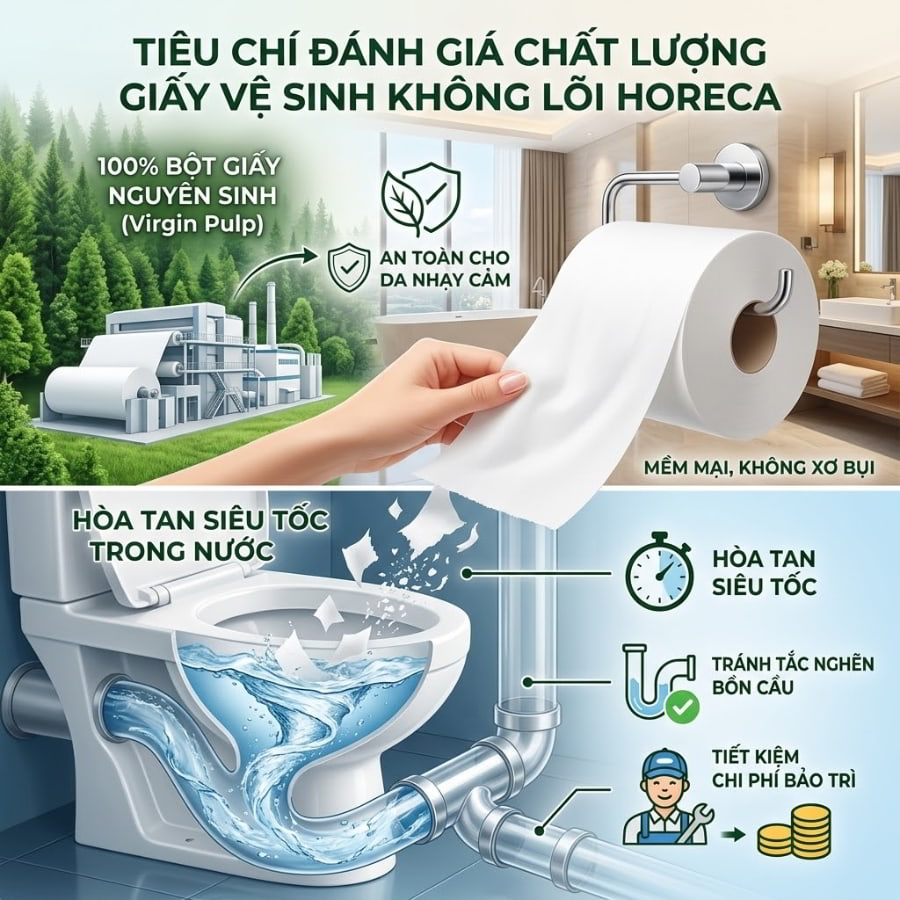 Không phải tất cả các loại giấy vệ sinh không lõi trên thị trường đều được sinh ra bình đẳng. Trong ngành dịch vụ Horeca (Khách sạn, Nhà hàng, Quán Cafe), nơi mà từng điểm chạm nhỏ nhất cũng quyết định định vị thương hiệu, chất lượng giấy vệ sinh phải đáp ứng những chuẩn mực vô cùng khắt khe.