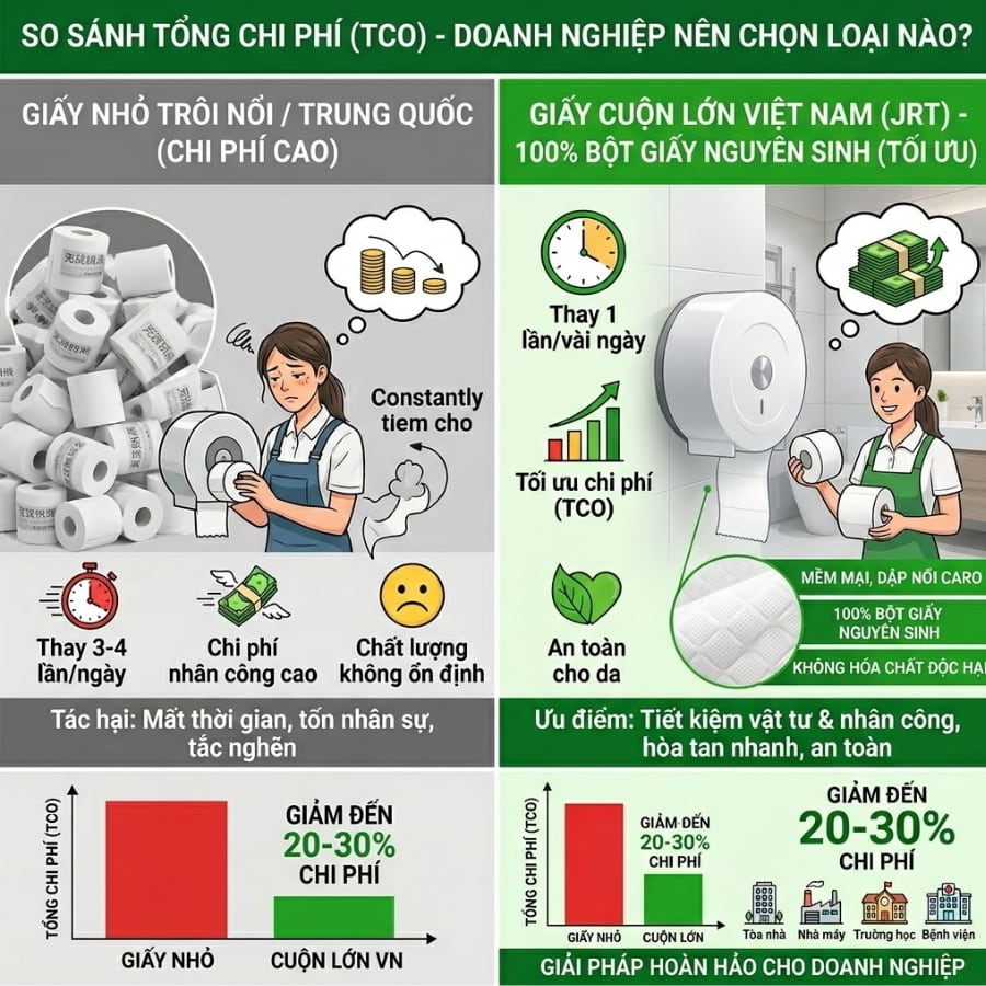 Khi đã nhận ra bài toán chi phí tổng thể (Total Cost of Ownership), hơn 18.000 doanh nghiệp tại Việt Nam đã chuyển hướng từ các loại giấy nhỏ lẻ trôi nổi sang sử dụng giấy vệ sinh cuộn lớn được sản xuất ngay trong nước. Đây là một sự chuyển dịch thông minh, mang tính chiến lược dài hạn.