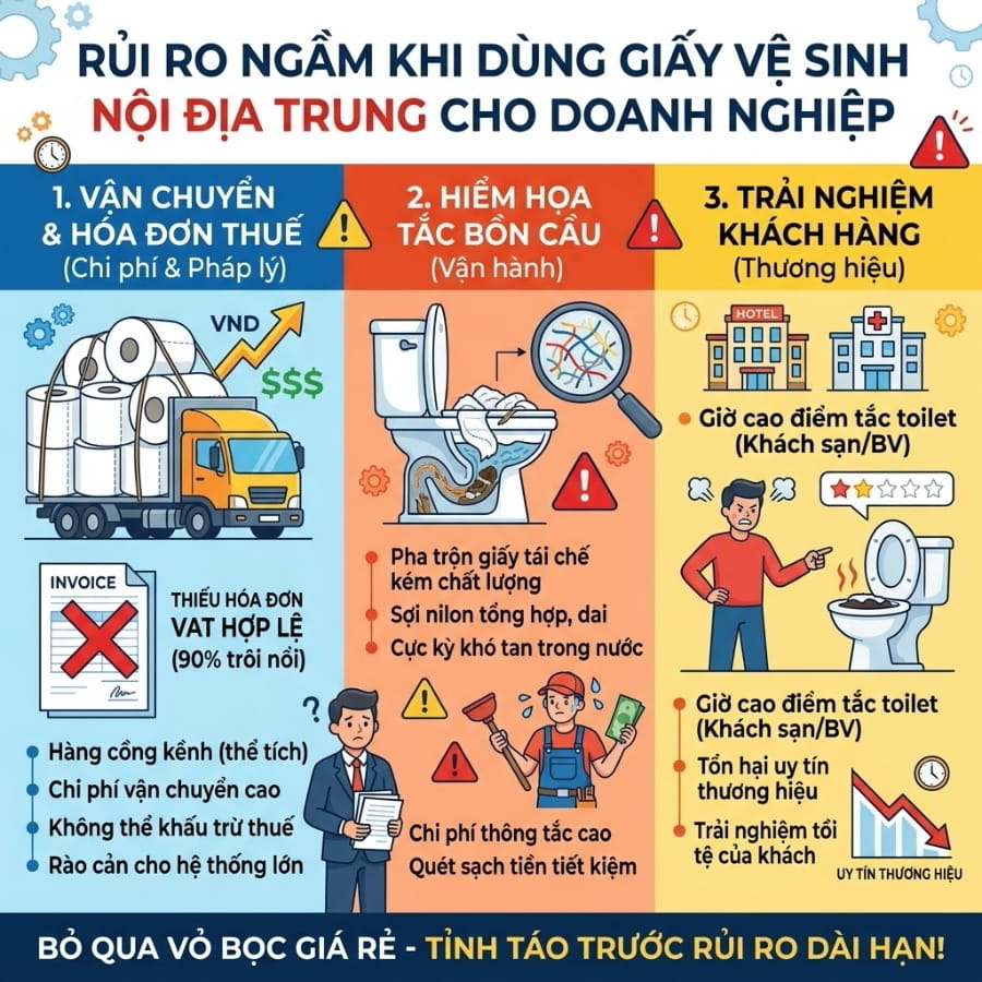 Bỏ qua lớp vỏ bọc giá rẻ, nếu bạn là một nhà quản lý đang tìm kiếm giải pháp giấy vệ sinh giá sỉ để vận hành dài hạn, bạn cần tỉnh táo trước những rủi ro trực tiếp ảnh hưởng đến dòng tiền và thương hiệu của mình.