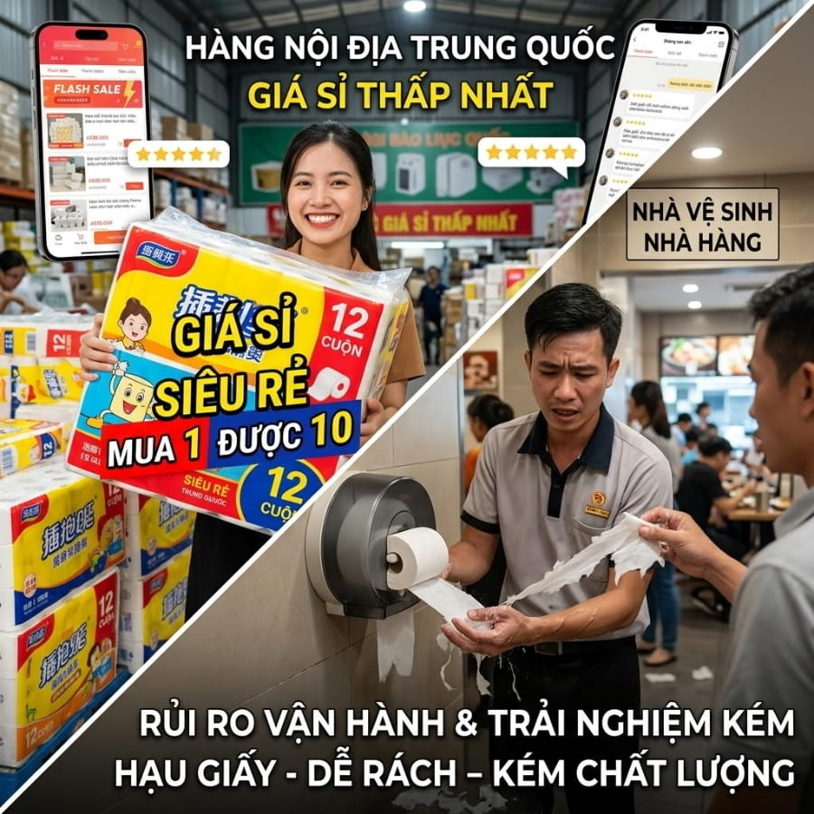 Thế nhưng, trong môi trường vận hành chuyên nghiệp (B2B) như giấy vệ sinh cho nhà hàng hay quán cafe đông khách, tiêu chí đánh giá một cuộn giấy không chỉ nằm ở giá tiền ban đầu. Khác biệt lớn nhất giữa việc mua dùng cá nhân và mua phục vụ khách hàng chính là rủi ro về trải nghiệm và chi phí vận hành ngầm. Đó là lúc những “điểm sáng” về giá của hàng nội địa Trung bắt đầu bộc lộ nhiều góc khuất.