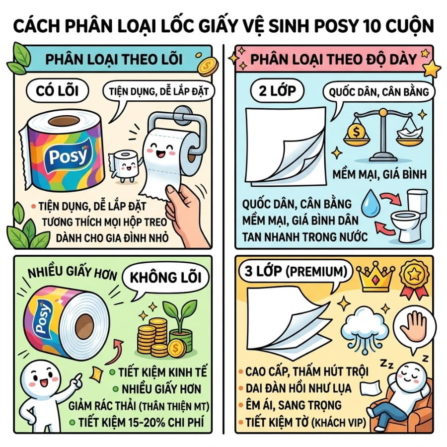 Thói quen tiêu dùng của mỗi cá nhân, gia đình hay tổ chức là hoàn toàn khác nhau. Hiểu được điều này, nhà sản xuất đã đa dạng hóa hệ sinh thái sản phẩm để đáp ứng mọi nhu cầu chuyên biệt. Lốc giấy vệ sinh Posy 10 cuộn không chỉ có một phiên bản duy nhất mà được chia thành nhiều dòng dựa trên cấu tạo lõi và độ dày của giấy. Việc hiểu rõ đặc tính của từng phân loại sẽ giúp bạn ngừng lãng phí ngân sách vào những sản phẩm không đúng mục đích sử dụng. Dưới đây là bức tranh toàn cảnh để bạn dễ dàng đưa ra quyết định mua sắm tối ưu nhất.