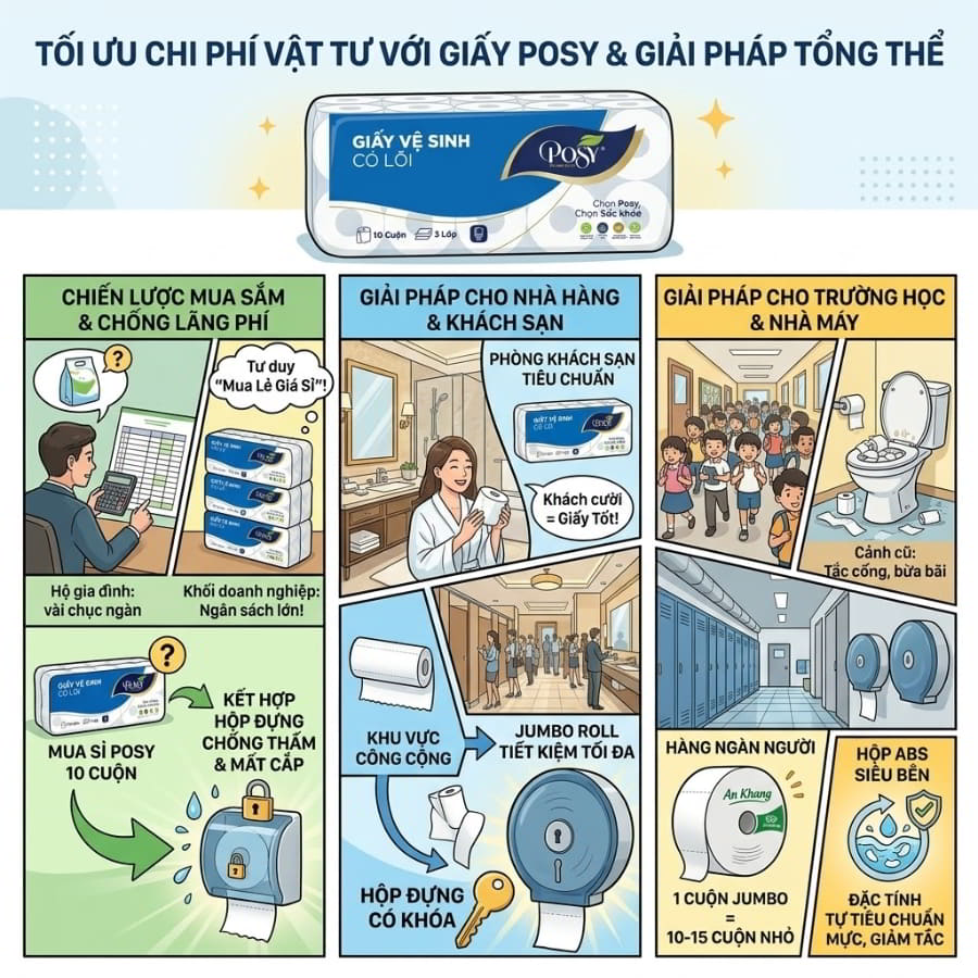 Nếu gia đình chỉ tốn vài chục ngàn tiền giấy mỗi tháng, thì đối với khối doanh nghiệp, đây là một khoản ngân sách vận hành khổng lồ. Việc áp dụng tư duy “mua lẻ giá sỉ” không chỉ nằm ở việc chọn lốc giấy vệ sinh Posy 10 cuộn, mà còn nằm ở chiến lược tổng thể và cách thức tìm nguồn cung ứng. Mỗi mô hình kinh doanh có một đặc thù riêng biệt, đòi hỏi những giải pháp tiêu hao khác nhau để vừa giữ được hình ảnh chuyên nghiệp trong mắt khách hàng, vừa cắt giảm chi phí chìm hiệu quả. Bằng cách kết hợp đúng loại giấy với đúng thiết bị bảo vệ (hộp đựng), doanh nghiệp có thể chống lại sự lãng phí do giấy ướt, mất cắp hoặc sử dụng vô tội vạ.
