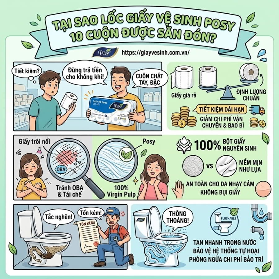 Bạn đã bao giờ cảm thấy bực bội vì cuộn giấy vệ sinh ở nhà “dùng vèo cái đã hết”, hay ám ảnh với những loại giấy đầy bụi trắng, mủn ra khi gặp nước và liên tục gây tắc bồn cầu? Rất nhiều gia đình và doanh nghiệp đang ném tiền qua cửa sổ mỗi tháng chỉ vì chọn sai loại vật tư tiêu hao tưởng chừng nhỏ bé này. Giữa hàng trăm thương hiệu trên thị trường, lốc giấy vệ sinh Posy 10 cuộn đang nổi lên như một “hiện tượng” cân bằng hoàn hảo giữa chất lượng cao cấp và bài toán kinh tế thực dụng. Tuy nhiên, nên mua loại có lõi hay không lõi? Giấy 2 lớp và 3 lớp khác nhau ở điểm nào? Và quan trọng nhất, mua ở đâu để có mức giá sỉ tốt nhất, tránh hàng nhái kém chất lượng? Hãy cùng mổ xẻ chi tiết qua cẩm nang toàn diện dưới đây.