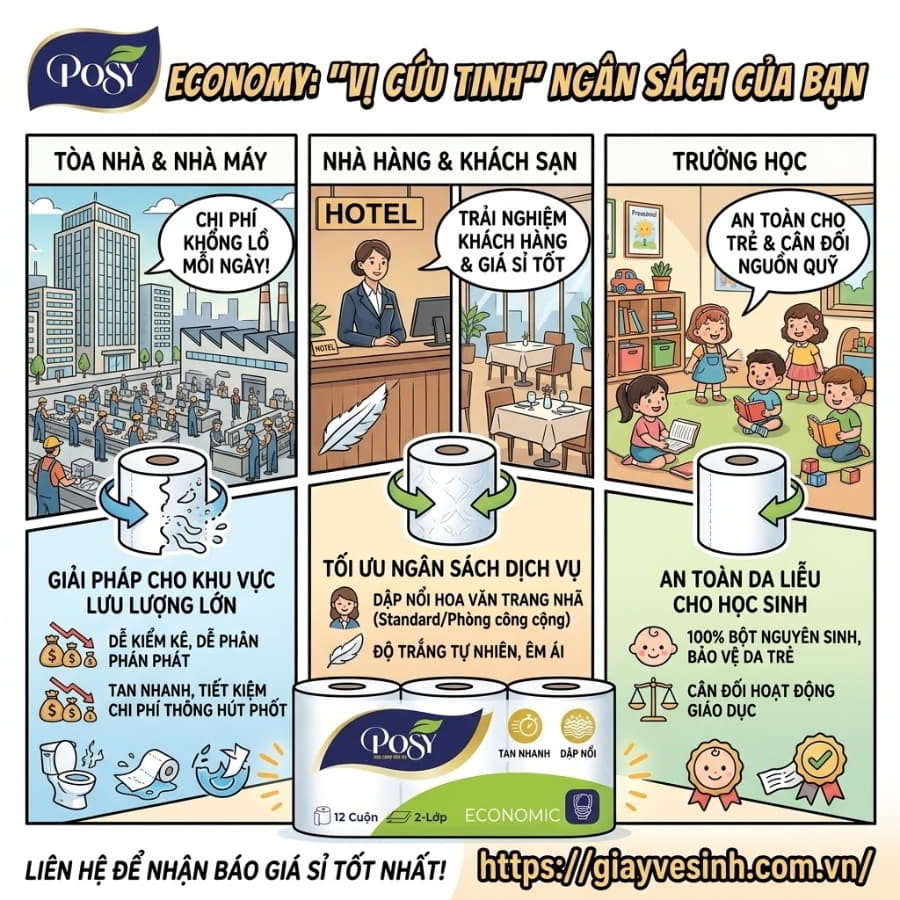 Đối với các khu công nghiệp hàng ngàn công nhân hay những cao ốc văn phòng sầm uất, lượng tiêu thụ giấy vệ sinh mỗi ngày là một con số khổng lồ. Việc sử dụng giấy vệ sinh cho nhà máy và giấy vệ sinh cuộn lớn cho tòa nhà thường là ưu tiên hàng đầu. Tuy nhiên, ở các khu vực buồng vệ sinh nhỏ hoặc các khu vực sinh hoạt chung không lắp đặt bộ hộp cuộn lớn, Posy Economy cuộn nhỏ lại là sự bổ sung hoàn hảo. Chi phí đầu tư ban đầu thấp, dễ dàng kiểm kê, phân phát, và quan trọng nhất là tính năng tan nhanh giúp ban quản lý tòa nhà tiết kiệm hàng chục triệu đồng tiền thuê dịch vụ thông hút bể phốt định kỳ mỗi năm.