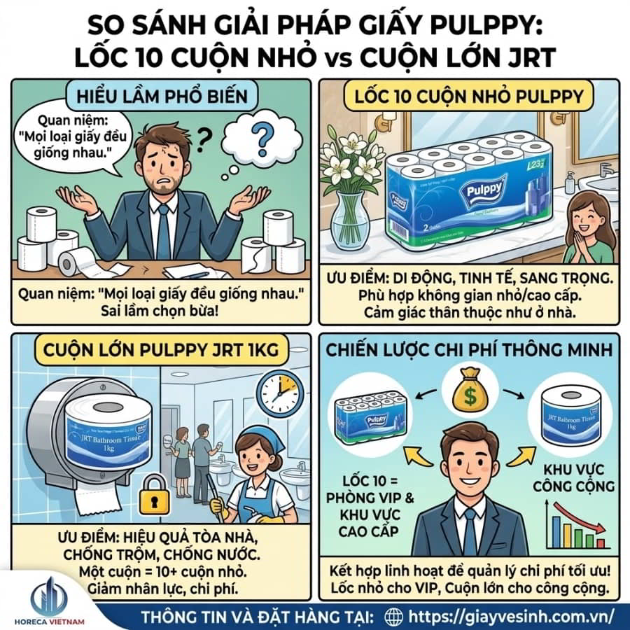 Tuy nhiên, nếu bạn đang quản lý một tòa nhà văn phòng đông đúc hoặc một trung tâm thương mại với lưu lượng người qua lại khổng lồ, việc nhân viên dọn dẹp phải liên tục đi thay từng cuộn giấy nhỏ sẽ gây lãng phí nhân lực rất lớn. Trong trường hợp này, các giải pháp chuyên nghiệp như giấy vệ sinh cuộn lớn cho tòa nhà sẽ là bài toán thay thế hoàn hảo. Một cuộn lớn có thể tương đương với 10 đến 15 cuộn nhỏ, được đặt trong các hộp đựng có khóa chống mất cắp, bảo vệ giấy khỏi tình trạng ướt nước. Dù lựa chọn định dạng nào, việc kết hợp linh hoạt giữa lốc 10 cuộn Pulppy cho phòng VIP và giấy vệ sinh cuộn lớn cho khu vực công cộng chính là chiến lược quản lý chi phí thông minh nhất mà mọi nhà quản trị cần nắm rõ.