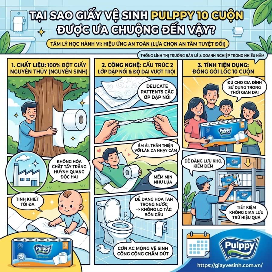 Trong tâm lý học hành vi, con người luôn có xu hướng lựa chọn những sản phẩm mang lại sự an tâm tuyệt đối (hiệu ứng an toàn). Giấy vệ sinh Pulppy 10 cuộn không phải ngẫu nhiên mà thống lĩnh thị trường bán lẻ lẫn doanh nghiệp trong suốt nhiều năm qua. Sự thành công này đến từ ba yếu tố cốt lõi: chất liệu, công nghệ và tính tiện dụng. Trước hết, Pulppy được làm từ 100% bột giấy nguyên thủy (nguyên sinh). Điều này đồng nghĩa với việc sản phẩm không qua quá trình tái chế chứa hóa chất tẩy trắng huỳnh quang độc hại, giữ được độ tinh khiết tối đa.