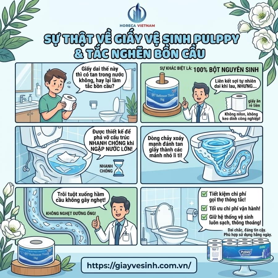 Giấy vệ sinh Pulppy có đặc tính dai khi lau (nhờ liên kết sợi dọc tự nhiên), nhưng lại được thiết kế để phá vỡ cấu trúc nhanh chóng khi ngập hoàn toàn trong nước với khối lượng lớn. Sự khác biệt nằm ở công nghệ xử lý: giấy không pha trộn nilon hay keo dính công nghiệp (như một số loại giấy ăn rẻ tiền). Khi xả nước bồn cầu, dòng chảy xoáy mạnh sẽ nhanh chóng đánh tan giấy Pulppy thành các mảnh nhỏ li ti, trôi tuột xuống hầm cầu mà không gây nghẹt đường ống. Điều này giúp bạn tiết kiệm được kha khá chi phí gọi thợ thông tắc bồn cầu mỗi năm, đồng thời giữ cho hệ thống vệ sinh luôn sạch sẽ, thông thoáng.