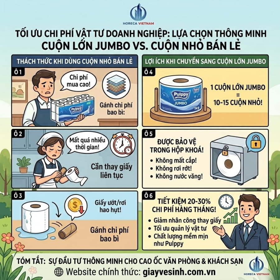 Hãy làm một phép tính nhanh. Khi bạn dùng giấy cuộn nhỏ cho một nhà hàng hay khách sạn đông đúc, nhân viên tạp vụ sẽ phải thay lõi giấy liên tục. Một cuộn giấy nhỏ bị ướt hoặc bị rơi mất lõi sẽ dẫn đến hao hụt. Hơn nữa, giá mua các lốc giấy bán lẻ luôn phải gánh thêm chi phí bao bì nilon, chi phí marketing siêu thị.
