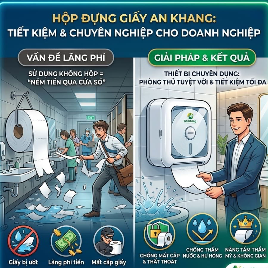 Bạn có biết, tại các khu vực công cộng, chi phí hao hụt giấy vệ sinh do ẩm ướt, rơi rớt hay lãng phí vô ý thức thường lớn gấp 3 lần lượng giấy thực sự được sử dụng? Đối với những doanh nghiệp đang sử dụng giấy vệ sinh cuộn lớn An Khang, việc sở hữu một chiếc hộp đựng giấy An Khang chuyên dụng không chỉ là phụ kiện trang trí. Nó là “tấm khiên” bảo vệ tài sản, nâng tầm thẩm mỹ và là chiến lược tối ưu chi phí vận hành sắc bén nhất.