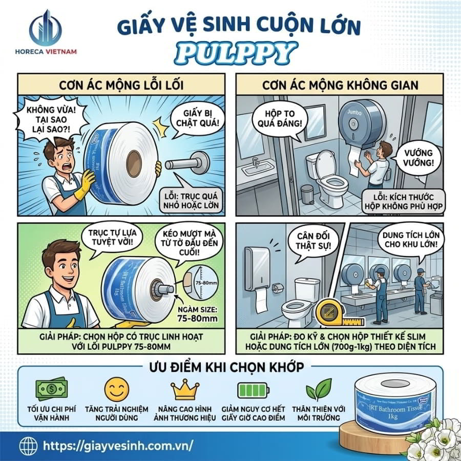 Đây chính là “điểm mù” mà 90% người đi mua hộp đựng giấy vệ sinh thường mắc phải. Mỗi thương hiệu giấy vệ sinh công nghiệp đều có một quy chuẩn riêng về đường kính lõi (phần ống carton ở giữa cuộn giấy), thường dao động từ 6cm đến 8cm. Đối với các dòng giấy cuộn lớn Pulppy, việc chọn hộp đựng có trục quay (spindle) không khớp với lõi giấy sẽ dẫn đến hai kịch bản tồi tệ: hoặc cuộn giấy không thể nhét vừa vào trục, hoặc trục quá nhỏ khiến cuộn giấy bị lỏng lẻo, xộc xệch và kẹt giấy khi kéo.