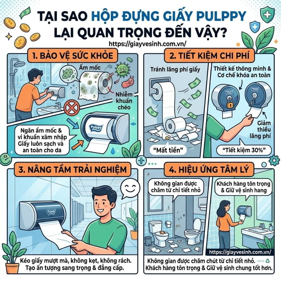 Sự thật là, việc lựa chọn giấy vệ sinh chất lượng chỉ là một nửa chặng đường. Nửa còn lại quyết định sự đẳng cấp, tiết kiệm và vệ sinh chính là hộp đựng giấy Pulppy chuẩn xác. Không chỉ đơn thuần là một vật chứa, các mẫu hộp đựng giấy chuyên dụng hiện nay được ví như những “chiếc két sắt” bảo vệ sức khỏe người dùng và tối ưu hóa ngân sách cho doanh nghiệp. Hãy cùng khám phá ngay những mẫu hộp đựng tương thích hoàn hảo, giúp biến không gian washroom của bạn trở nên chuyên nghiệp và tinh tế nhất!