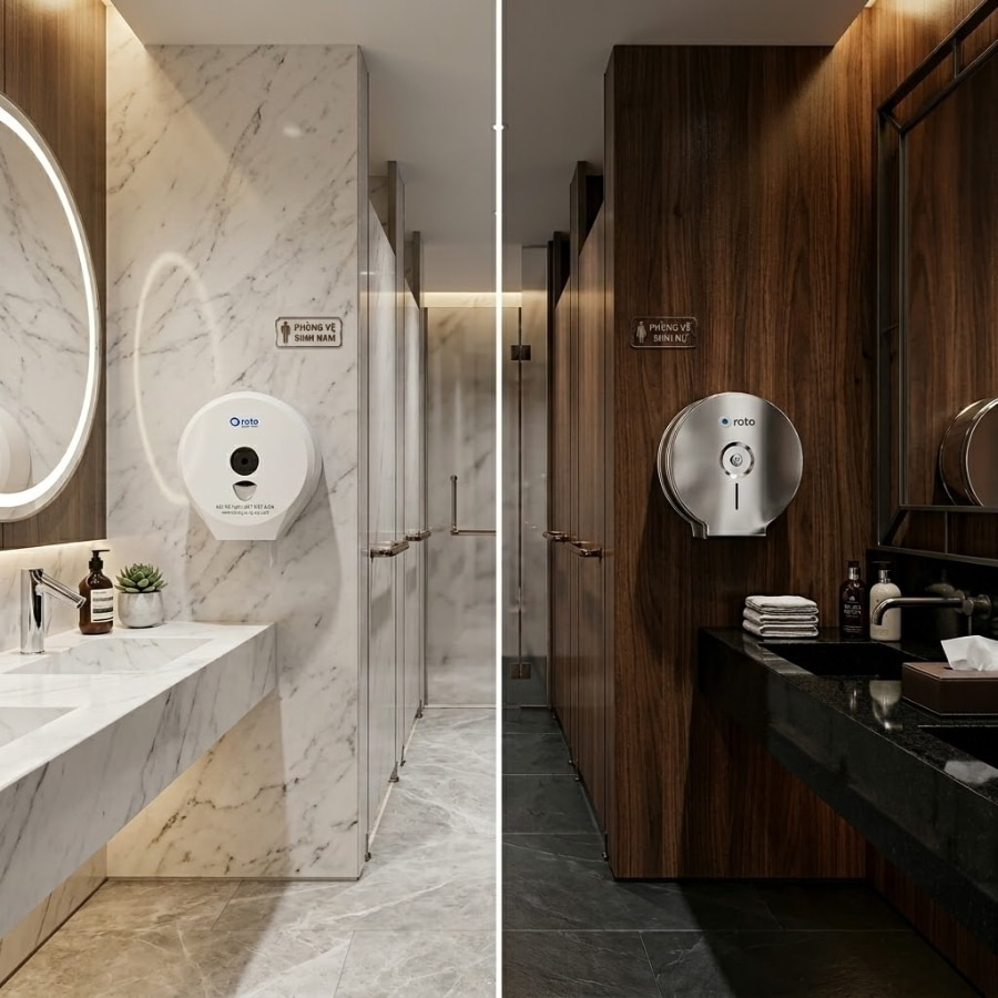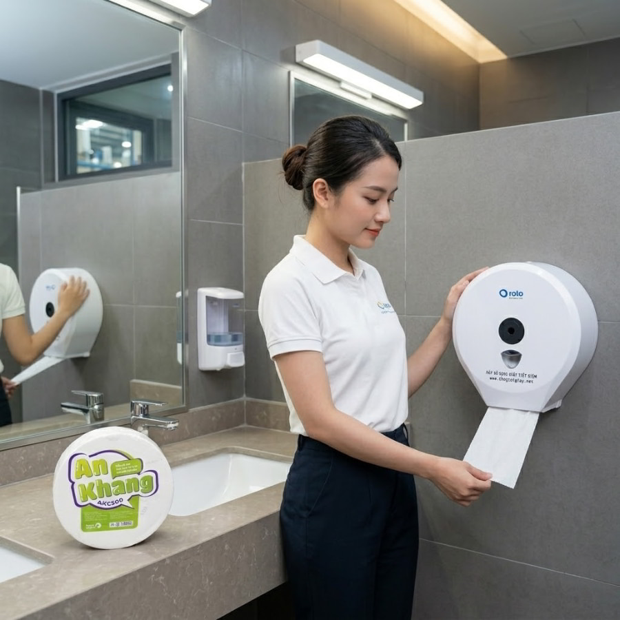 Trong môi trường có tần suất sử dụng liên tục như nhà máy hay trung tâm thương mại, khu vực vệ sinh thường xuyên đối mặt với tình trạng đọng nước và độ ẩm cao. Nếu chỉ đặt những cuộn giấy khổng lồ lên bệ cửa sổ hay nóc bồn cầu, giấy sẽ lập tức trở thành miếng bọt biển hút ẩm.