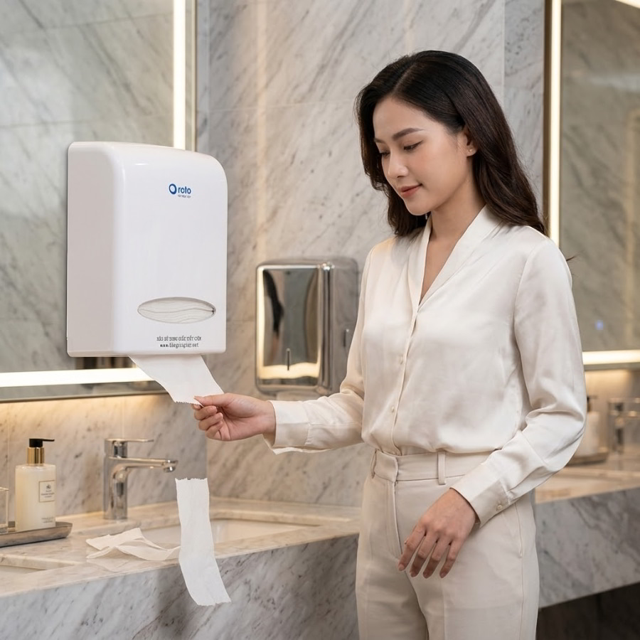 Việc kết hợp giấy lau tay và giấy vệ sinh không chỉ là sự bổ sung về mặt vật tư, mà là một bước đi chiến lược trong quản trị rủi ro và nâng tầm dịch vụ. Khi khách hàng bước ra khỏi buồng vệ sinh và tiến đến bồn rửa, tay họ đang ướt. Nếu không có giấy lau tay chuyên dụng, họ sẽ vẩy nước xuống sàn, lau tạm vào quần áo, hoặc rút hàng mét giấy vệ sinh thông thường (vốn rất mỏng và dễ mủn) để thấm nước, để lại những mảnh vụn giấy lấm tấm dính chặt vào tay. Điều này tạo ra một cảm giác vô cùng bức bối và mất vệ sinh.