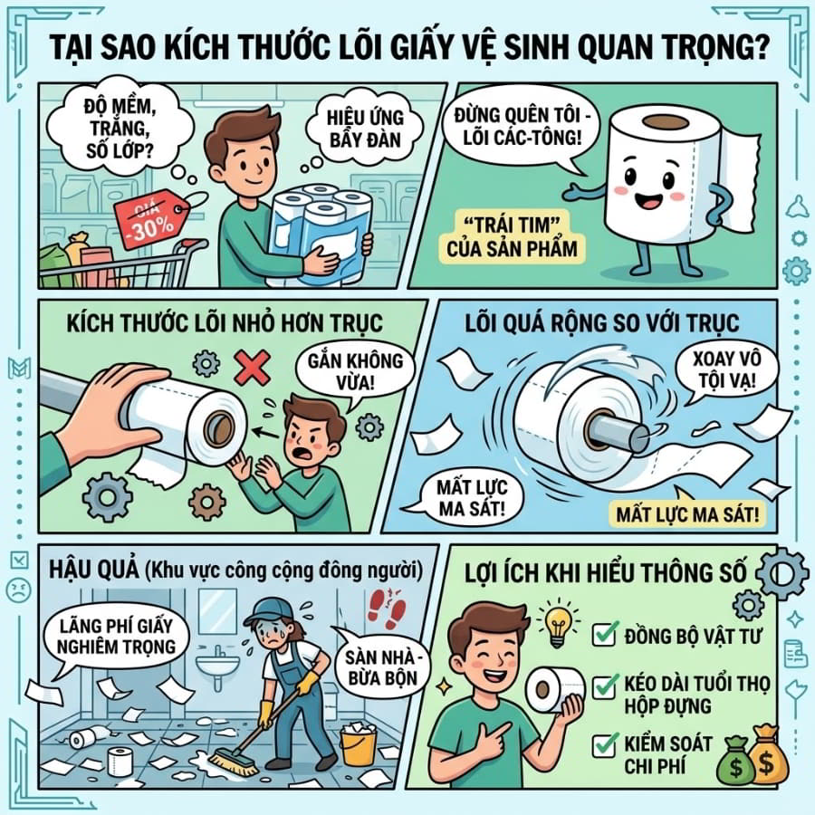 Có bao giờ bạn mua một lốc giấy vệ sinh đắt tiền về, hồ hởi bóc ra để thay vào hộp đựng trong toilet, nhưng rồi bất lực nhận ra: lõi giấy quá nhỏ không thể nhét vừa trục xoay, hoặc lõi quá to khiến cuộn giấy lỏng lẻo, kéo một phát là rớt cả cuộn xuống sàn? Sự cố nhỏ nhoi này không chỉ gây khó chịu tột độ trong gia đình, mà đối với các doanh nghiệp, khách sạn hay nhà hàng, nó là một “lỗ hổng” vận hành gây lãng phí hàng triệu đồng mỗi tháng.