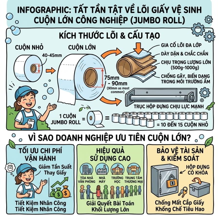 Sở dĩ lõi phải to như vậy là vì trục của các hộp đựng giấy cuộn lớn treo tường cần có tiết diện đủ rộng để phân tán lực, chống gãy rụng khi người dùng kéo giấy với lực mạnh. Một cuộn Jumbo Roll tương đương với 10 đến 15 cuộn nhỏ cộng lại, do đó lõi các-tông bên trong được ép nhiều lớp dày dặn, chống biến dạng tối đa trong môi trường ẩm ướt của nhà vệ sinh công cộng.