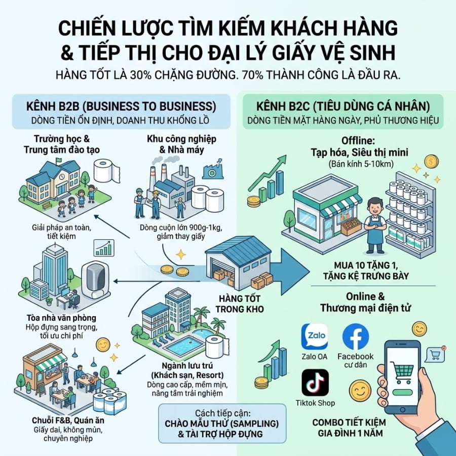 Kênh B2B (Business to Business) chính là “đại dương xanh” mang lại doanh thu khổng lồ cho đại lý giấy vệ sinh. Khác với bán lẻ từng lốc giấy cho hộ gia đình, khách hàng B2B mua theo thùng, theo kiện và mua đều đặn mỗi tháng. Đây là đối tượng bạn cần dồn toàn lực để chăm sóc.