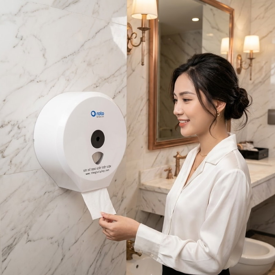 Thứ hai, đó là sự giải phóng sức lao động. Giấy cuộn lớn kết hợp với hộp đựng có khóa an toàn giúp giảm thiểu tình trạng hao hụt, mất cắp và bảo vệ giấy khỏi tình trạng ướt nhẹp do nước văng vào. Nhân viên tạp vụ của bạn thay vì phải kiểm tra toilet mỗi 30 phút, nay chỉ cần thay giấy 1-2 ngày một lần. Điều này giảm tần suất thay thế đáng kể, tối ưu hóa nhân sự và triệt tiêu hoàn toàn rủi ro “hết giấy giữa chừng” khiến khách hàng phàn nàn.