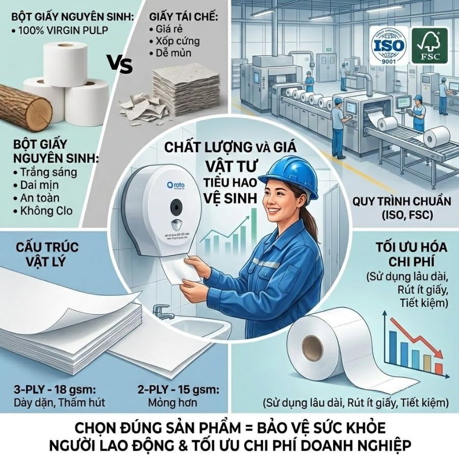 Chênh lệch giá cả giữa các nhà cung cấp trên thị trường không phải là “chiêu trò”, mà nó phản ánh chân thực bản chất cấu thành của sản phẩm. Khi đánh giá vật tư tiêu hao nhà máy, đặc biệt là giấy vệ sinh và nước tẩy rửa, người mua hàng thông thái không chỉ nhìn vào mác giá cuối cùng. Chất lượng nguyên vật liệu, hệ thống dây chuyền sản xuất đạt chuẩn (như ISO hay FSC), và cấu trúc vật lý của bản thân sản phẩm mới là những bánh răng cốt lõi định hình nên giá trị. Chọn đúng sản phẩm tức là bạn đang bảo vệ sức khỏe cho hàng ngàn người lao động.