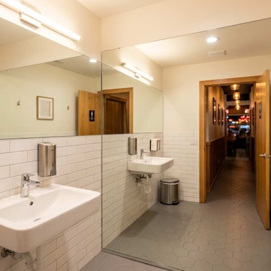 Nhà vệ sinh quán ăn bình dân thường có diện tích hẹp và tối tăm, tạo cảm giác ngột ngạt. Lời khuyên là hãy vứt bỏ những bóng đèn huỳnh quang cũ kỹ, ánh sáng yếu. Thay vào đó, hãy trang bị bóng đèn LED ánh sáng trắng hoặc vàng ấm với công suất cao. Ánh sáng mạnh giúp mọi thứ trông rạng rỡ và sạch sẽ hơn. Kế đến, hãy lắp một chiếc gương lớn hơn so với kích thước cũ. Gương không chỉ phục vụ nhu cầu chỉnh trang của thực khách mà còn tạo ảo giác quang học, nhân đôi diện tích không gian và phản xạ ánh sáng, khiến một phòng vệ sinh nhỏ bé trở nên thoáng đãng hơn bội phần.