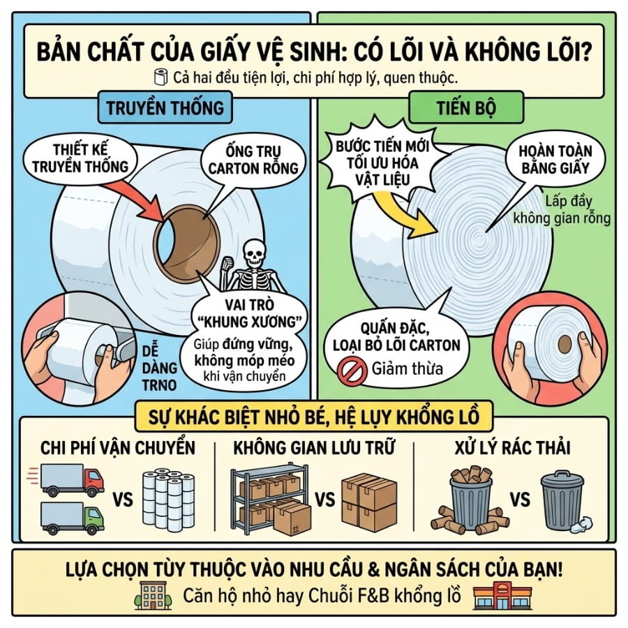 Bạn đã bao giờ tự hỏi tại sao chúng ta lại tiếp tục trả tiền cho những lõi bìa carton rỗng, chỉ để vứt chúng đi ngay sau khi sử dụng hết cuộn giấy? Theo các chuyên gia quản lý vật tư, con người thường mắc phải “thiên kiến duy trì hiện trạng” (Status Quo Bias) – chúng ta mua giấy có lõi đơn giản vì thói quen, mà không nhận ra nó có thể làm rò rỉ ngân sách vận hành của doanh nghiệp và gia đình. Nếu bạn là một quản lý mua hàng hoặc một người nội trợ thông thái đang băn khoăn nên dùng giấy có lõi hay không lõi, bài viết này của Horeca Việt Nam sẽ mổ xẻ tường tận “nỗi đau” lãng phí và giúp bạn chọn ra giải pháp hoàn hảo nhất.