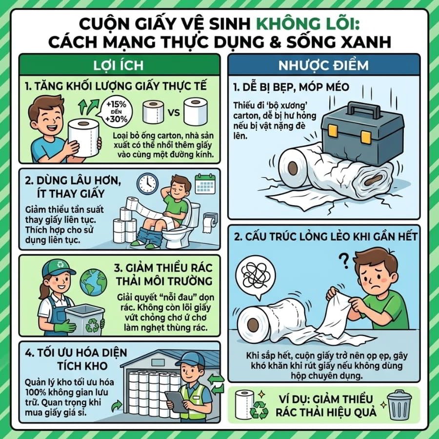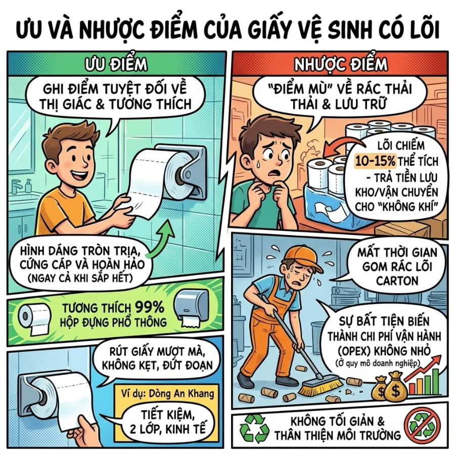 Tuy nhiên, “điểm mù” của dòng sản phẩm này nằm ở bài toán rác thải và không gian lưu trữ. Lõi bìa carton thường chiếm khoảng 10% đến 15% tổng thể tích của cuộn giấy. Điều này đồng nghĩa với việc khi bạn mua sỉ số lượng lớn, bạn đang phải trả tiền lưu kho và phí vận chuyển cho một lượng “không khí” đáng kể. Hơn nữa, với những nơi có lưu lượng người sử dụng dày đặc, nhân viên tạp vụ sẽ phải tốn một lượng thời gian khổng lồ chỉ để đi gom và vứt bỏ những chiếc lõi carton lăn lóc dưới sàn. Ở quy mô doanh nghiệp, sự bất tiện này biến thành một khoản chi phí vận hành (OpEx) không hề nhỏ. Do đó, nếu bài toán của bạn là sự tối giản và thân thiện với môi trường, giấy có lõi có thể không phải là ứng cử viên sáng giá nhất.