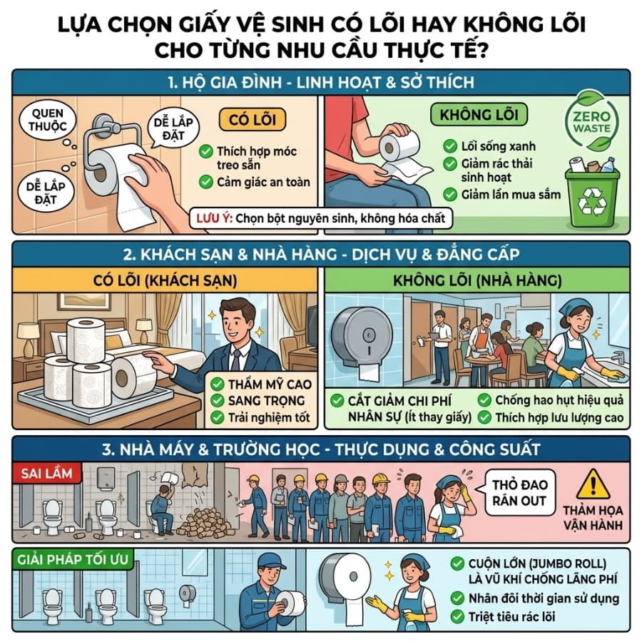 Với những so sánh và phân tích chi tiết trên, hy vọng việc quyết định nên dùng giấy vệ sinh có lõi hay không lõi sẽ trở nên dễ dàng và chính xác hơn, giúp các gia đình và doanh nghiệp tối ưu ngân sách, hạn chế rác thải và nâng cao hiệu quả vận hành trong quá trình sử dụng lâu dài.