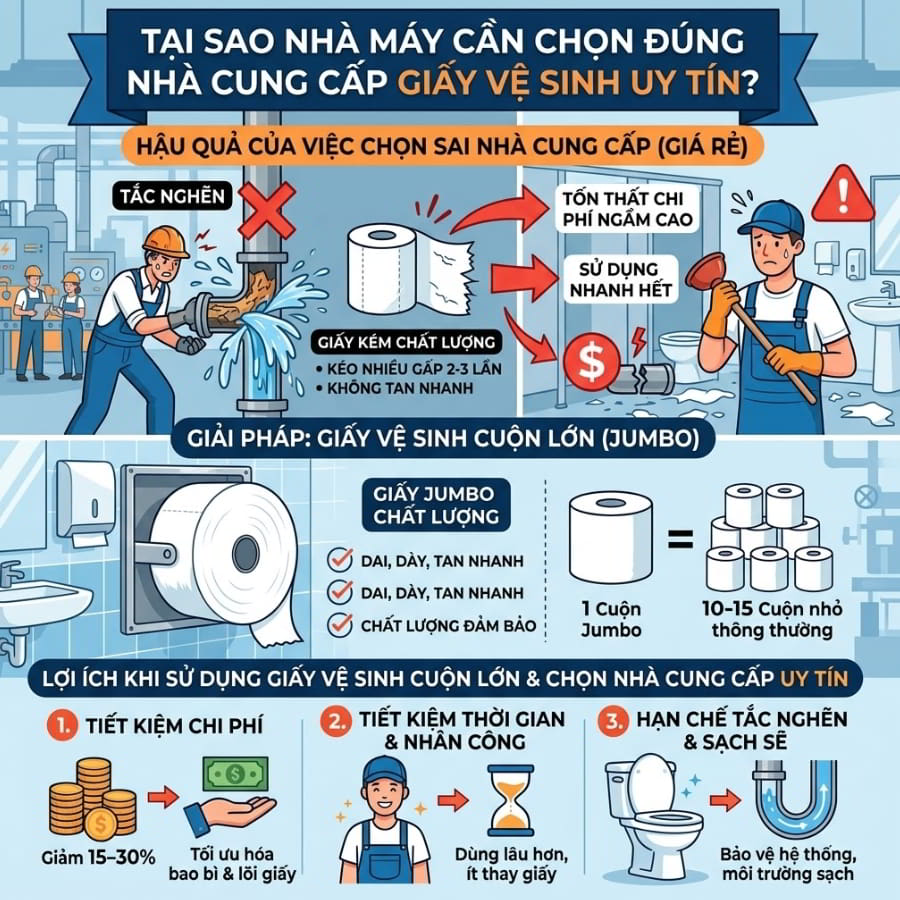 Bạn là Trưởng phòng Mua hàng hay Quản lý Hành chính tại một nhà máy quy mô hàng nghìn công nhân? Chắc hẳn bạn đã từng trải qua “cơn ác mộng” mang tên: giấy vệ sinh hết liên tục, công nhân phàn nàn vì giấy thô ráp gây dị ứng, hay tồi tệ hơn là hệ thống bồn cầu của cả phân xưởng bị tắc nghẽn nghiêm trọng do giấy không phân hủy. Những sự cố tưởng chừng nhỏ nhặt này lại ngốn đi hàng chục triệu đồng chi phí bảo trì và làm gián đoạn nghiêm trọng năng suất lao động.