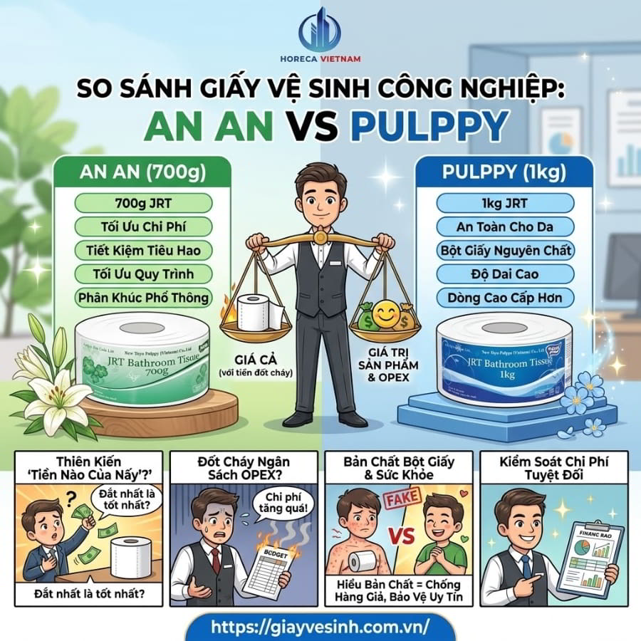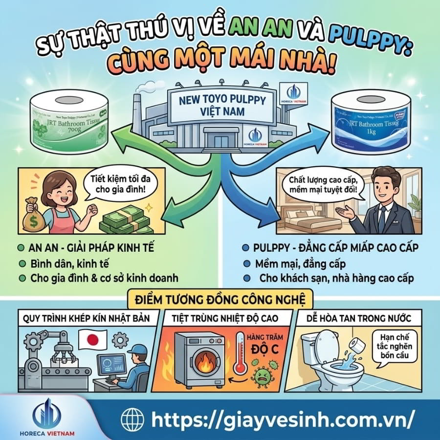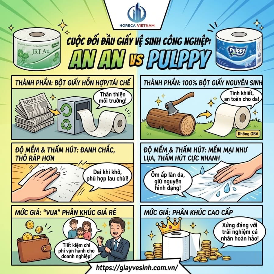 Có một sự thật thú vị mà rất ít người tiêu dùng cũng như các quản lý thu mua vật tư tiêu hao nhận ra: Giấy vệ sinh An An giá rẻ, bình dân và giấy Pulppy cao cấp, đắt tiền mà bạn thấy ở mọi siêu thị thực chất là “anh em ruột”. Cả hai đều được sinh ra từ cùng một dây chuyền, cùng một nhà máy sản xuất. Việc thiếu thông tin này khiến nhiều doanh nghiệp tranh cãi nảy lửa khi chọn mua vật tư, dẫn đến tình trạng lãng phí ngân sách hoặc vô tình mua phải hàng giả mạo trôi nổi trên thị trường. Bài viết dưới đây của Horeca Việt Nam sẽ bóc tách so sánh an an và pulppy từng điểm giống và khác nhau, giúp bạn có cái nhìn chuẩn xác nhất để đưa ra quyết định mua sắm tối ưu!