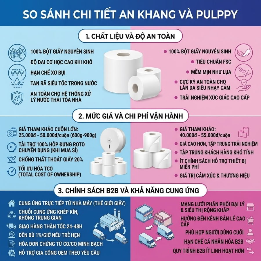 Việc đặt lên bàn cân so sánh An Khang và Pulppy không chỉ đơn thuần là so sánh về mặt giá cả, mà là bài toán chiến lược về vận hành và trải nghiệm khách hàng. Đối với các tổ chức quy mô lớn, một sự thay đổi nhỏ về định lượng giấy hoặc độ dai của mỗi cuộn cũng có thể nhân lên thành hàng trăm triệu đồng chi phí hao hụt mỗi năm. Thị trường hiện nay tràn ngập các bài viết xếp hạng chung chung, đánh đồng nhu cầu của người tiêu dùng cá nhân (B2C) với nhu cầu của tổ chức (B2B). Thực tế, một doanh nghiệp không cần những cuộn giấy nhỏ gọn với bao bì sặc sỡ. Họ cần một hệ sinh thái đồng bộ: giấy cuộn lớn từ 500g đến 1kg giúp giảm công thay thế, khả năng tan nhanh bảo vệ đường ống, và quan trọng nhất là các chính sách hỗ trợ thiết bị hộp đựng đi kèm.