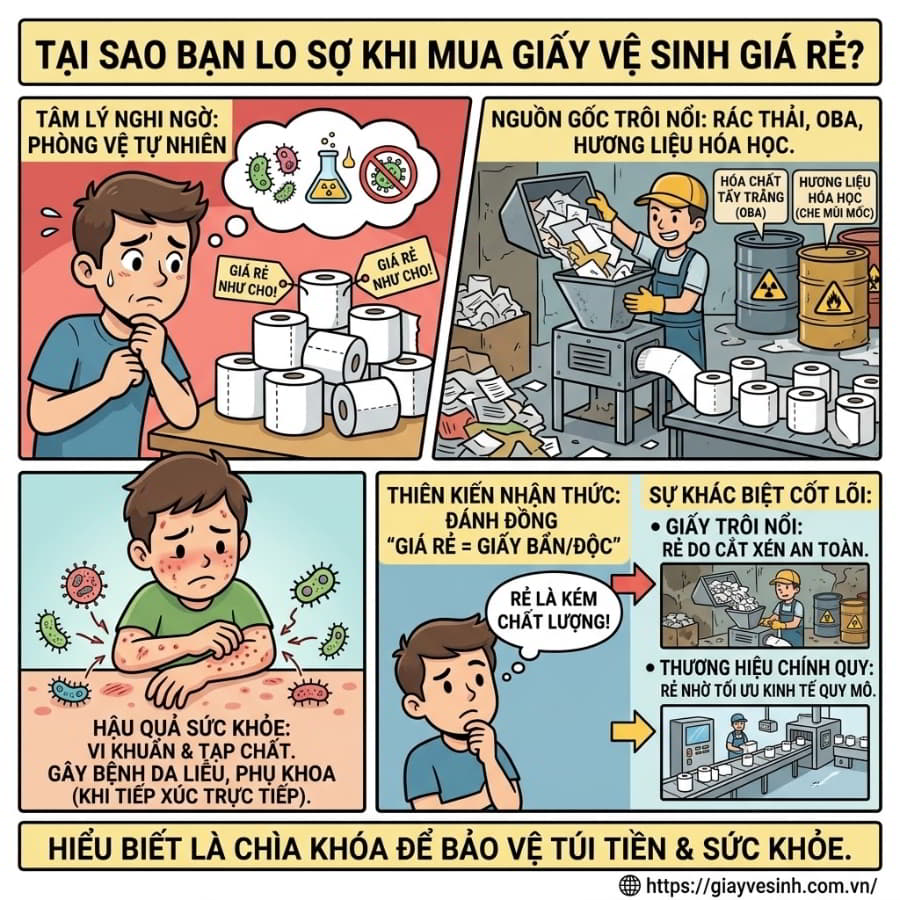 Tâm lý nghi ngờ của người tiêu dùng đối với các sản phẩm giá rẻ, đặc biệt là các mặt hàng tiếp xúc trực tiếp với cơ thể như giấy vệ sinh, là điều hoàn toàn có cơ sở và mang tính phòng vệ tự nhiên. Trong nhiều năm qua, thị trường Việt Nam đã chứng kiến sự thâm nhập của vô số các xưởng gia công giấy chui, sản xuất ra những cuộn giấy trôi nổi, không nhãn mác. Để ép giá xuống mức thấp nhất nhằm thu lợi bất chính, các cơ sở này thu gom rác thải giấy tạp nham, không qua phân loại kỹ lưỡng, sau đó lạm dụng hóa chất tẩy trắng công nghiệp độc hại (như OBA) và hương liệu hóa học để che giấu mùi ẩm mốc.