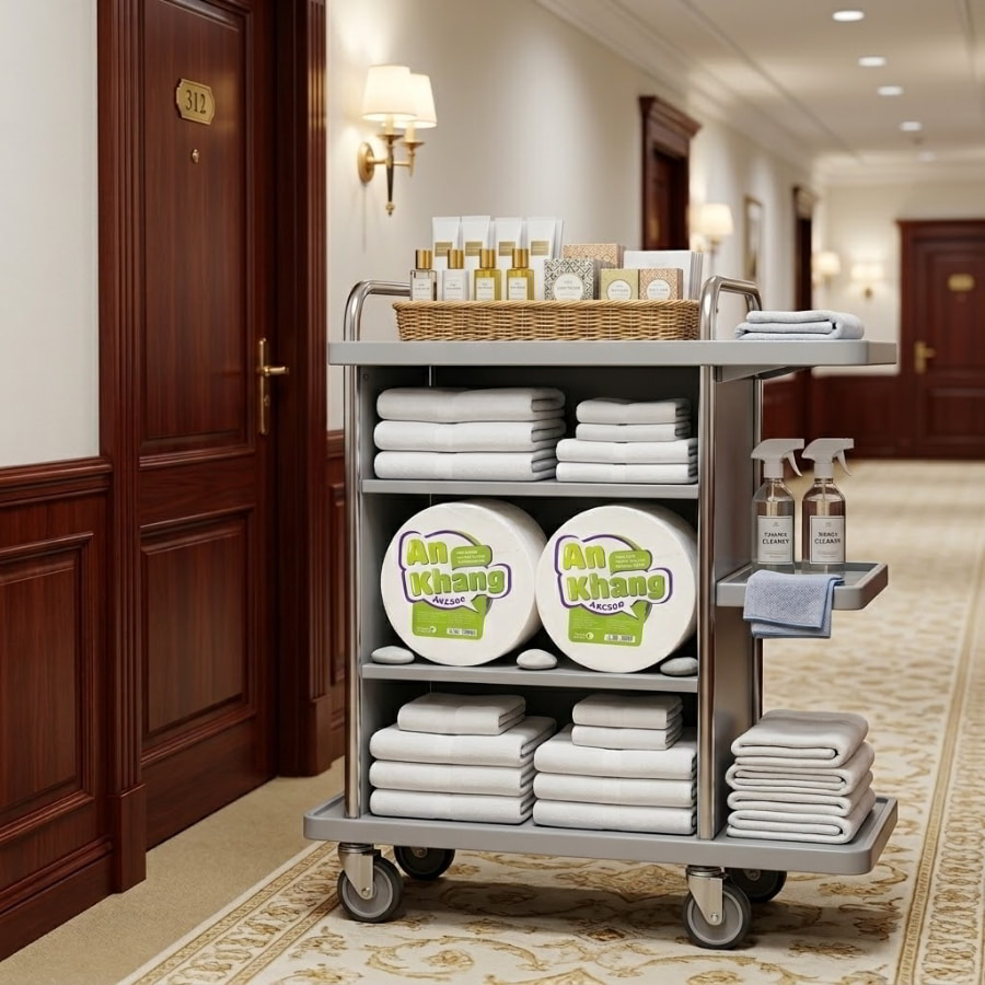 Đứng dưới góc độ quản trị doanh nghiệp, mọi vật tư tiêu hao trong khách sạn đều là một bài toán kinh tế cần tính toán chi li. Giấy vệ sinh cuộn lớn – hay còn gọi là giấy vệ sinh công nghiệp – là loại giấy được sản xuất với kích thước và trọng lượng lớn hơn nhiều lần so với các loại giấy cuộn nhỏ thường dùng trong hộ gia đình.