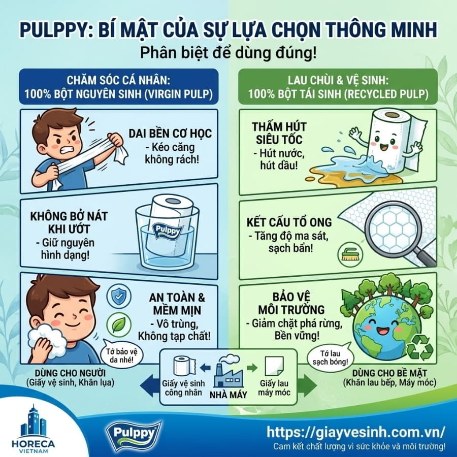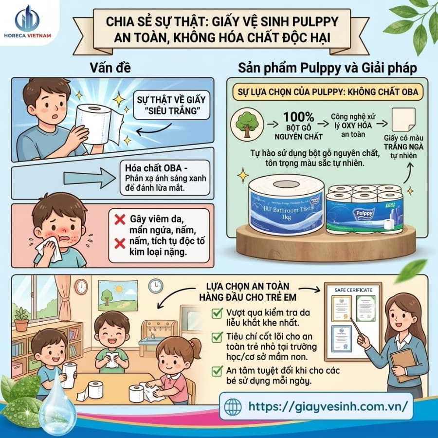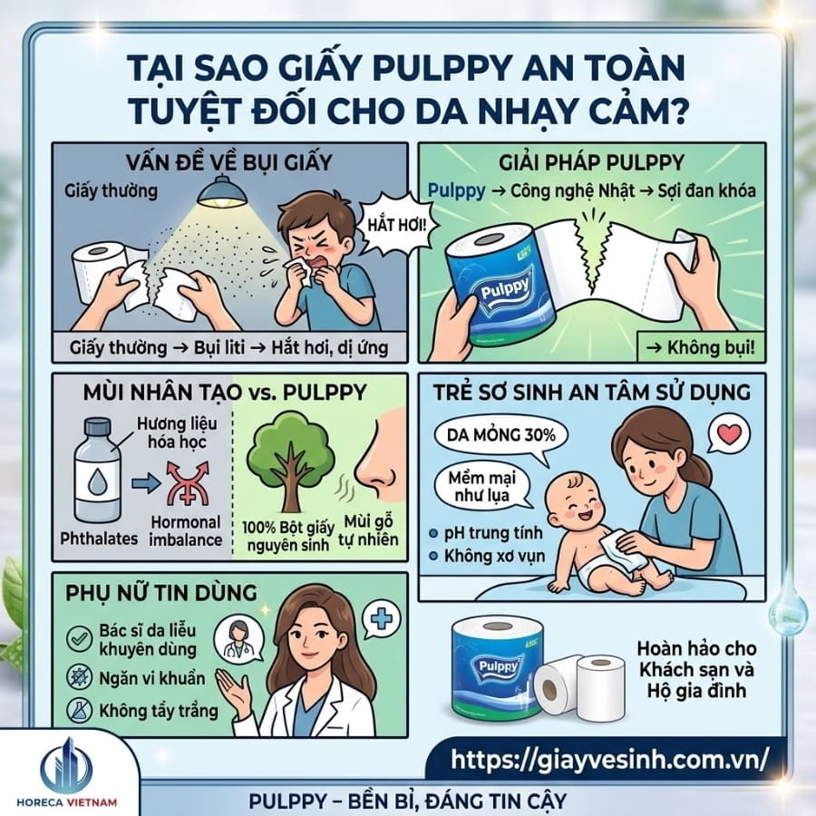 Bạn có bao giờ giật mình khi nhận ra thứ vật dụng tiếp xúc trực tiếp với những vùng da nhạy cảm nhất của cơ thể mỗi ngày lại có thể là “ổ chứa” của hóa chất và vi khuẩn? Hàng triệu người vẫn vô tình mang các loại giấy vệ sinh kém chất lượng, ngập tràn chất tẩy trắng huỳnh quang vào không gian sống của mình. Đó là một rủi ro sức khỏe thầm lặng. Tuy nhiên, sự xuất hiện của giấy vệ sinh Pulppy đã thay đổi hoàn toàn tiêu chuẩn an toàn trong ngành tiêu dùng nhanh. Được hàng ngàn gia đình Việt và các chuỗi khách sạn 5 sao tin tưởng, bí mật thực sự đằng sau sự thành công này nằm ở bảng thành phần chuẩn mực. Hãy cùng Horeca Việt Nam bóc tách chi tiết thành phần giấy Pulppy để hiểu vì sao đây lại là lá chắn bảo vệ hoàn hảo cho sức khỏe gia đình và doanh nghiệp của bạn.