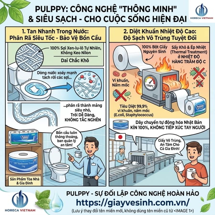 Một trong những nỗi ám ảnh lớn nhất của các nhà quản lý tòa nhà là tình trạng tắc nghẽn bồn cầu do giấy vệ sinh không phân hủy. Thành phần giấy Pulppy sở hữu một nghịch lý công nghệ tuyệt vời: Vô cùng dai chắc khi ở trạng thái khô, nhưng lại tan rã nhanh chóng khi gặp môi trường nước có lực xoáy mạnh. Điều này có được là nhờ cấu trúc sợi xen-lu-lô tự nhiên không bị pha trộn keo kết dính nilon như các loại giấy rẻ tiền.