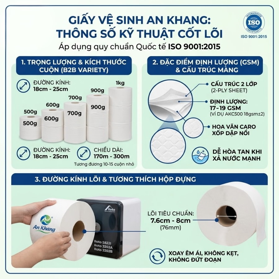 Thị trường B2B có những đòi hỏi khắt khe về tính đa dạng. Giấy vệ sinh An Khang được định hình với các mức trọng lượng phổ biến bao gồm 500g, 600g, 700g, 900g và thậm chí 1kg. Đường kính của mỗi cuộn công nghiệp thường dao động từ 18cm đến 25cm tùy thuộc vào mức trọng lượng. Với thông số này, chiều dài của mỗi cuộn lớn có thể đạt từ 170m đến 300m giấy, tương đương với dung lượng của 10 đến 15 cuộn giấy nhỏ dùng trong gia đình. Sự linh hoạt này cho phép một văn phòng 20 người chọn cuộn 500g, trong khi một trung tâm thương mại tấp nập ưu tiên dòng 900g để giảm thiểu số lần thay thế nhân công.