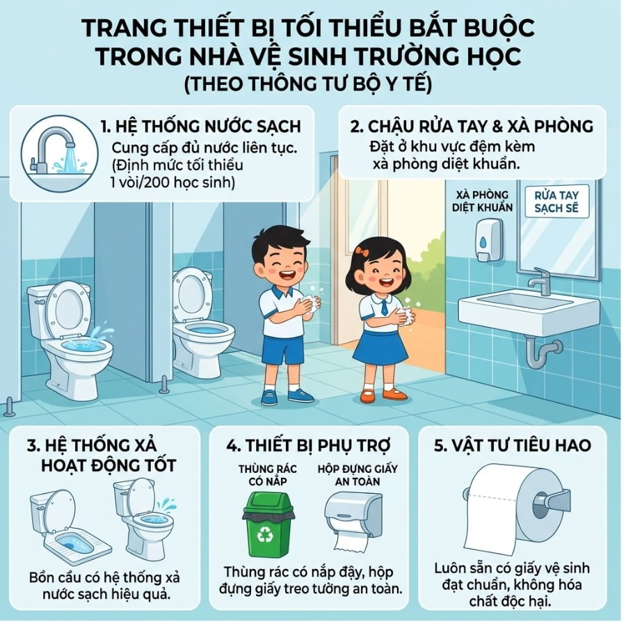 Những trang thiết bị tối thiểu nào bắt buộc phải có trong nhà vệ sinh trường học?