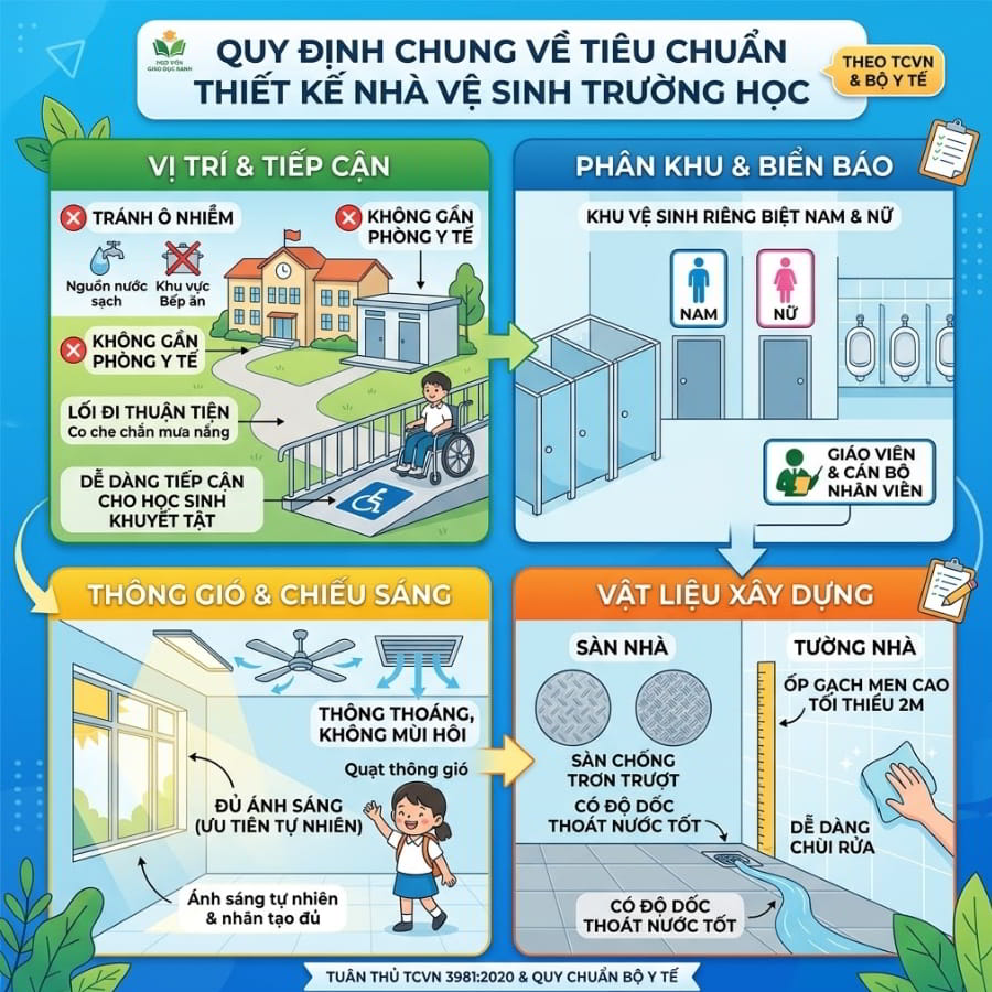 - Vị trí xây dựng: Nhà vệ sinh không được xây dựng ở những vị trí dễ gây ô nhiễm nguồn nước sinh hoạt hoặc khu vực bếp ăn. Không xây gần phòng y tế. Phải có lối đi thuận tiện, có che chắn mưa nắng và dễ dàng tiếp cận cho cả học sinh khuyết tật.