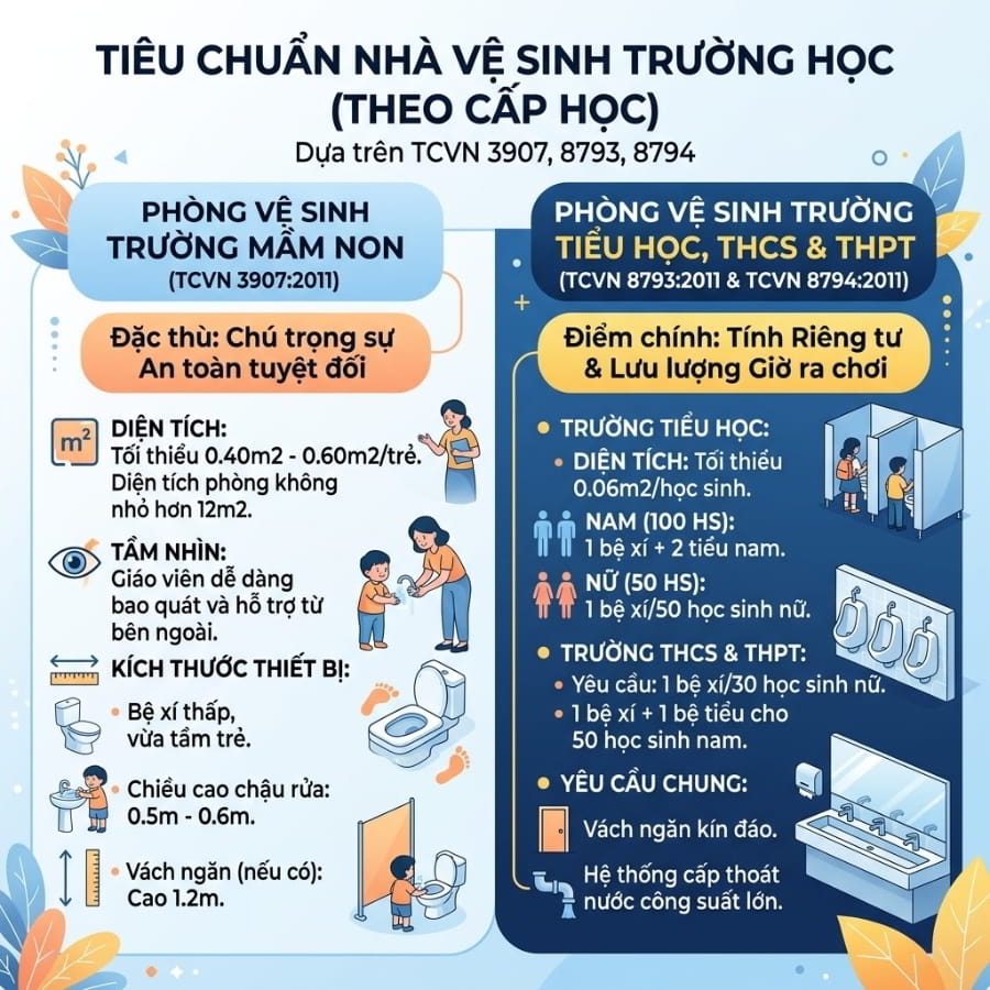 Tiêu chuẩn nhà vệ sinh trường học theo từng cấp bậc (Mầm non đến THPT) ra sao?