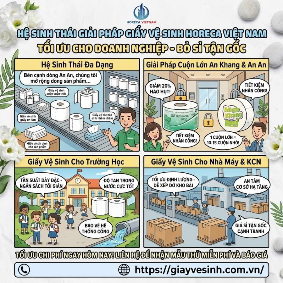 Khu công nghiệp và môi trường giáo dục lại đòi hỏi một bài toán khác: Tần suất sử dụng cực kỳ dày đặc nhưng ngân sách lại phải tối giản. Thấu hiểu điều này, Horeca đã phát triển các dòng sản phẩm chuyên biệt như giấy vệ sinh cho trường học giấy vệ sinh cho nhà máy.