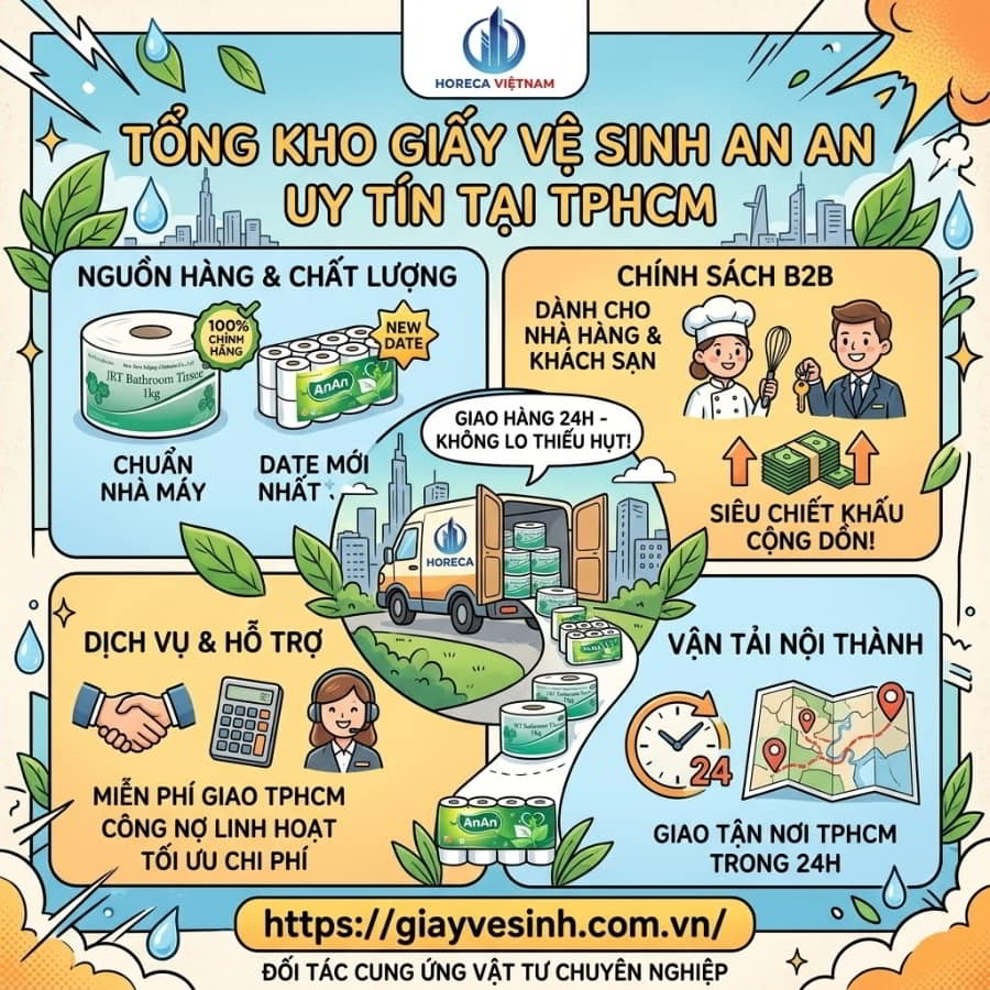 Nếu bạn đang tìm kiếm tổng kho giấy an an TPHCM Horeca Việt Nam chính là câu trả lời mang tính thẩm quyền và an toàn nhất. Với hơn 10 năm kinh nghiệm thiết lập hệ thống cung ứng cho ngành F&B và lưu trú, chúng tôi tự hào là đối tác chiến lược trực tiếp phân phối dòng giấy vệ sinh An An chính hãng.