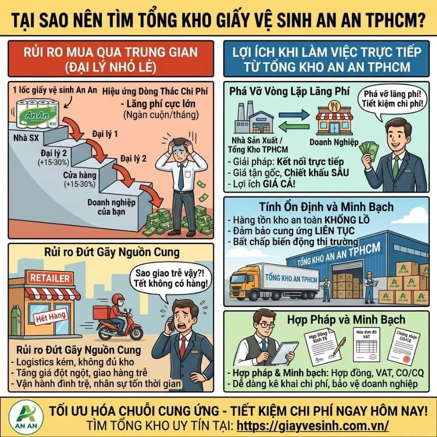 Theo hiệu ứng “dòng thác chi phí” trong chuỗi cung ứng, mỗi khi một lốc giấy vệ sinh đi qua một tầng trung gian (từ nhà sản xuất $\rightarrow$ đại lý cấp 1 $\rightarrow$ đại lý cấp 2 $\rightarrow$ cửa hàng bán lẻ $\rightarrow$ doanh nghiệp của bạn), giá thành sản phẩm sẽ bị đội lên từ 15% đến 30%. Sự lãng phí này là cực kỳ khủng khiếp nếu bạn nhân lên với số lượng hàng ngàn cuộn giấy tiêu thụ mỗi tháng.