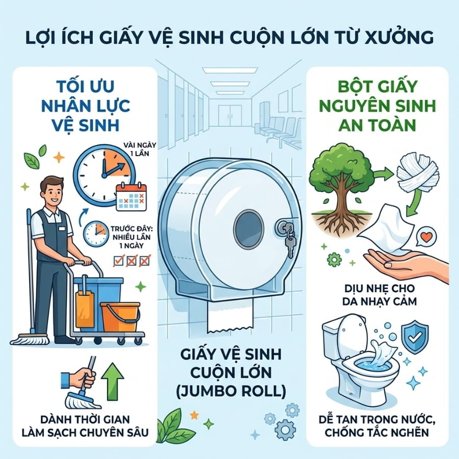 Thay vì phải liên tục kiểm tra và bổ sung giấy mới vào từng phòng vệ sinh nhiều lần trong ngày, nhân viên tạp vụ giờ đây chỉ cần thực hiện thao tác này vài ngày một lần. Thời gian dư thừa đó có thể được tái phân bổ cho các công việc làm sạch chuyên sâu khác, góp phần nâng cao chất lượng môi trường làm việc tổng thể. Đặc biệt tại các khu vực công cộng có mật độ người sử dụng đông đúc, việc sử dụng giấy vệ sinh cuộn lớn kết hợp với các thiết bị hộp đựng chuyên dụng có khóa bảo vệ còn ngăn chặn hiệu quả tình trạng mất cắp hoặc giấy bị ướt, hư hỏng do tác động từ bên ngoài, giúp không gian luôn duy trì sự gọn gàng và chuyên nghiệp tối đa.